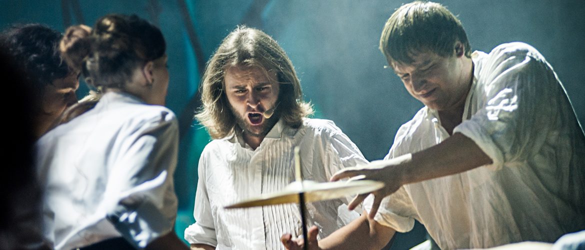 The center of musical scenography is the prepared piano, that turns into a real orchestra. The pianist and singers use a wide range of percussion instruments such as snare drum, marimba and timpani sticks, triangle, ride cymbal. They use coins, keys, fingers and nails for playing on the strings and the body of the grand piano. The instrument sounds like a harpsichord, drums and occasionally as a synthesizer or electronic sounds generator.
