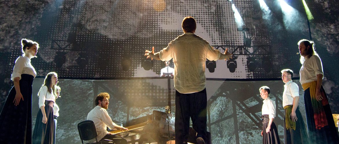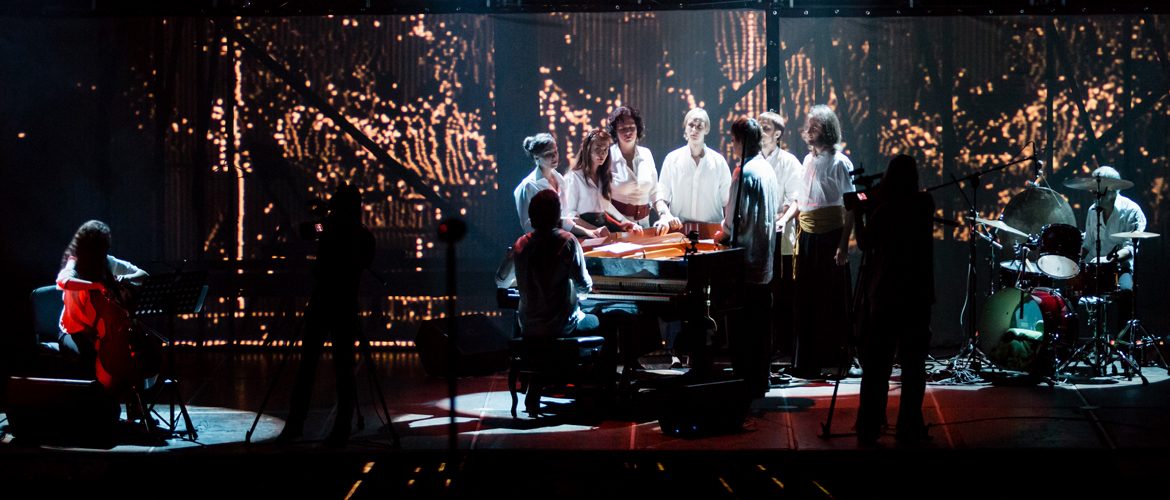 “IYOV, Heavenly punishment & post-revolutionary syndrome”Piano sounds like percussion, synthesizer or harpsichord. When the vocal ensemble starts their throat singing, and the light colors in red figures around the instrument. There are the images of priests or shamans that tell fortunes around a huge cauldron of magic potion. The camera takes instrument inside – sometimes, the image appears on a large projection screen. All action is endowed with the mysteriological character that aims to attract viewers to a specific experience that they can take to their everyday life. At the end of the performance singers go down into the concert hall with the drum plates and extract the sound close to the audience. This creates the effect of belonging to the realized artistic experience. A story that is told in the opera IYOV sounds as a reminder of the need to respect ourselves and not to lose hope under any circumstances. And only then life will triumph over nothing.